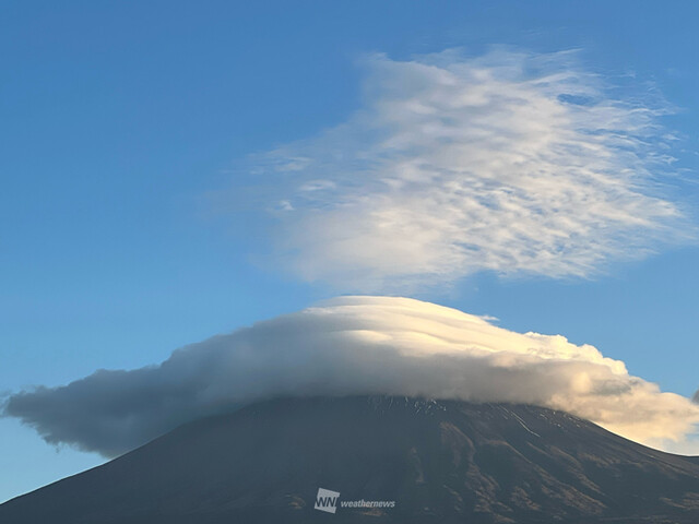 富士山が笠雲の帽子を被る 上空は風強く、形がいろいろ変わる(ウェザーニ