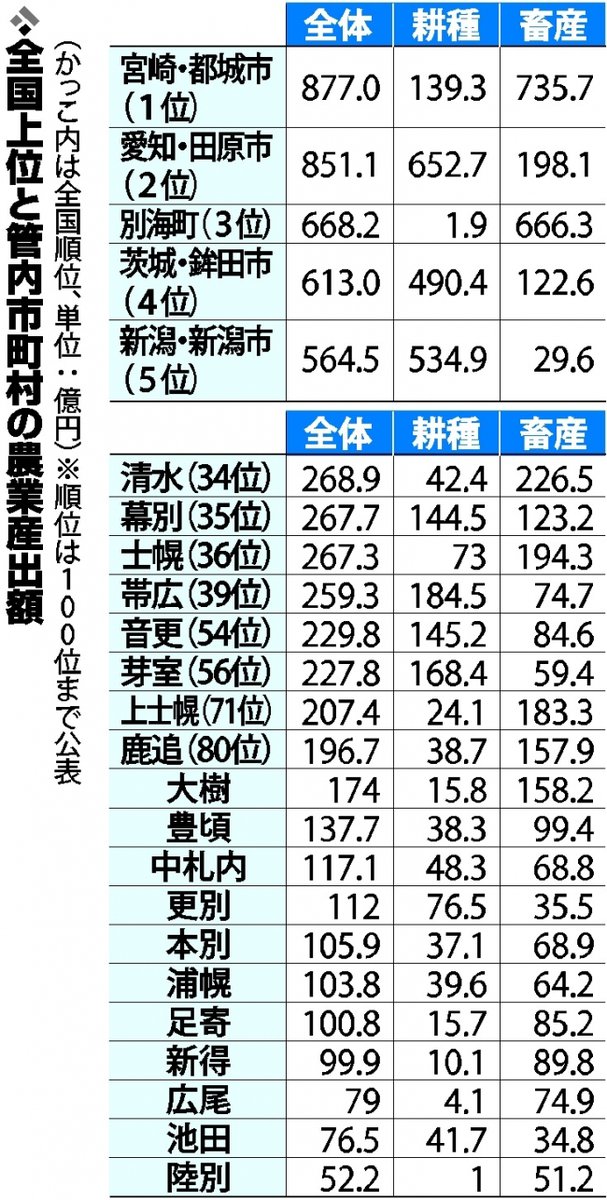 清水269億円で管内首位 市町村別農業産出額(十勝毎日新聞) - https://