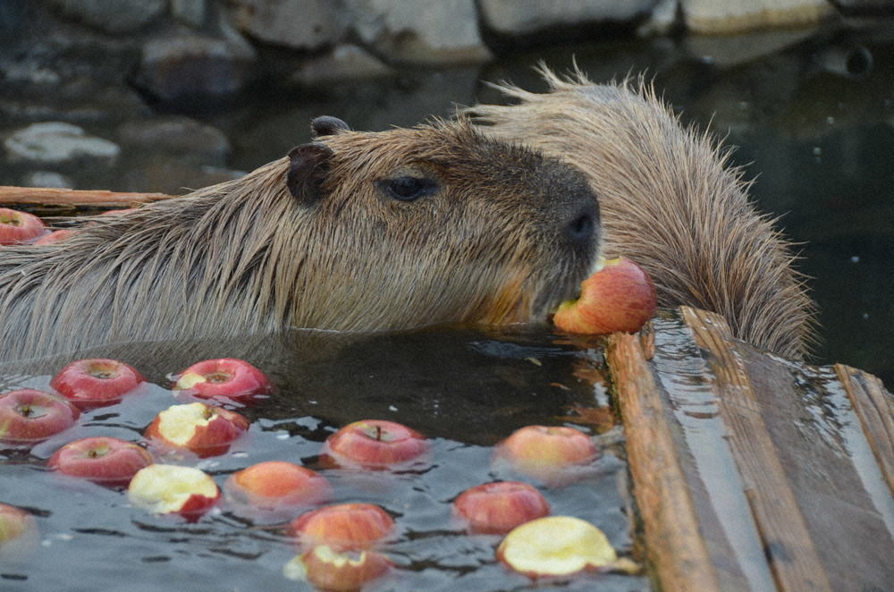 好物のリンゴ湯にカピバラご満悦 栃木・那須どうぶつ王国(毎日新聞) - Ya