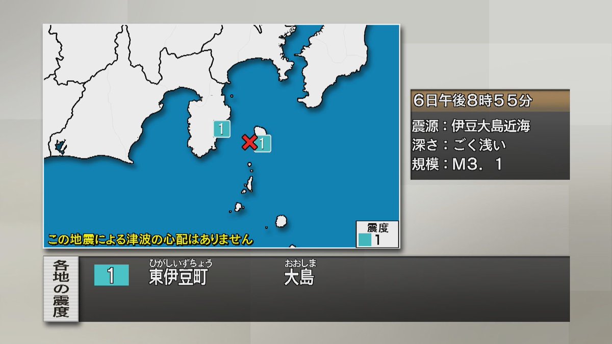 【地震速報】静岡・東伊豆町で震度1 震源は伊豆大島近海(静岡朝日テレビ)