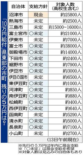 10万円給付、静岡県東部20市町の多くが「全額現金」希望 「未定」市町もク