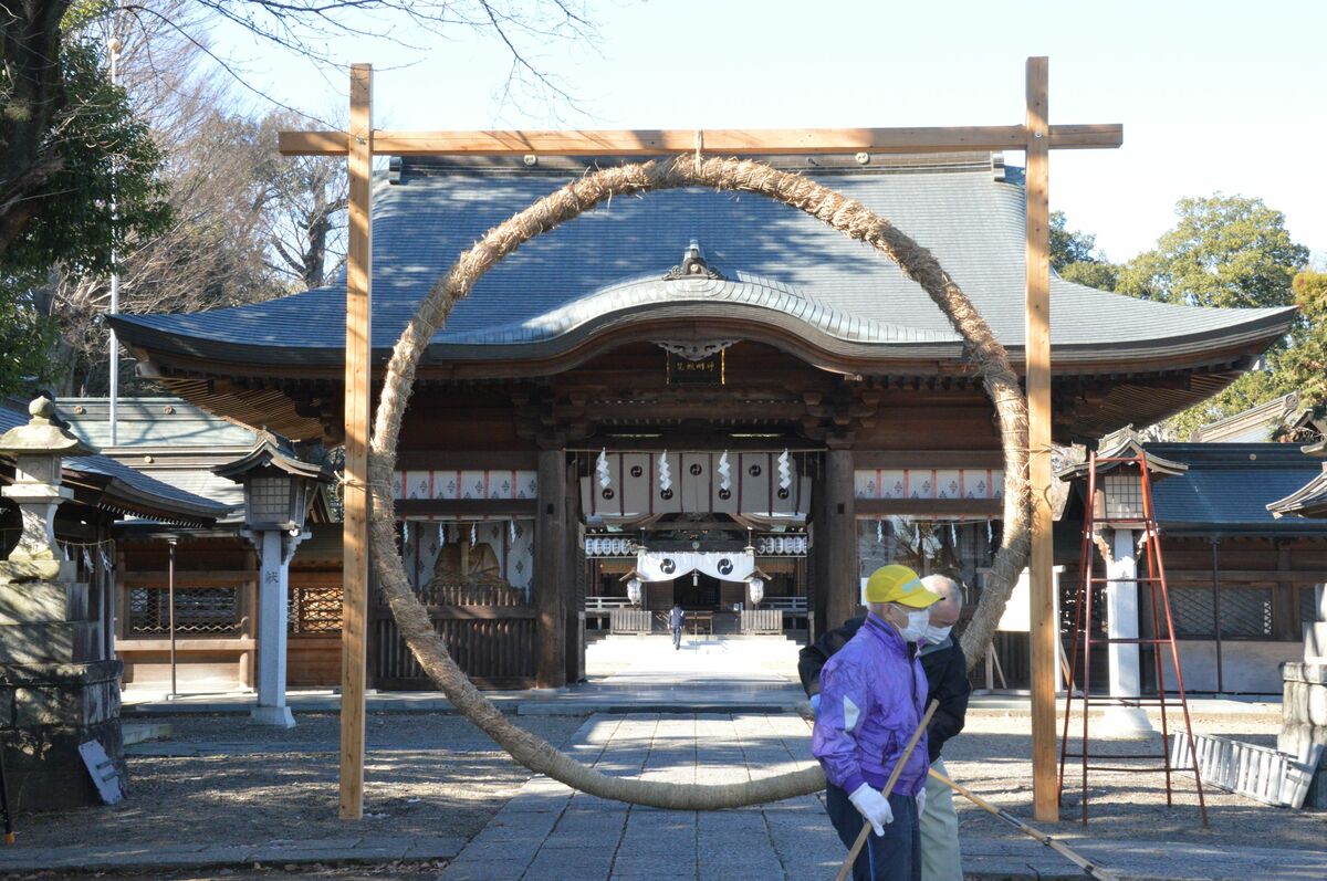 恒例の「大茅の輪」お目見え 小山、須賀神社 直径5メートル、輪くぐり身清
