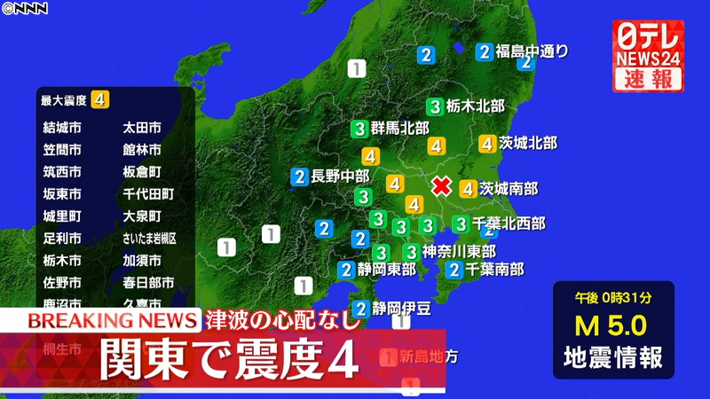 結城市などで震度4 津波の心配なし(日本テレビ系(NNN)) - Yahoo!ニュ