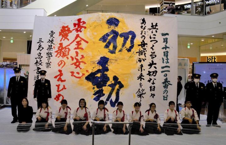正しい110番、高校生が書道で啓発 松前でPRイベント 音楽に合わせ演技 -