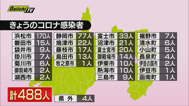 15日 静岡県内の新型コロナ新規感染者は488人 浜松市では2日連続で一