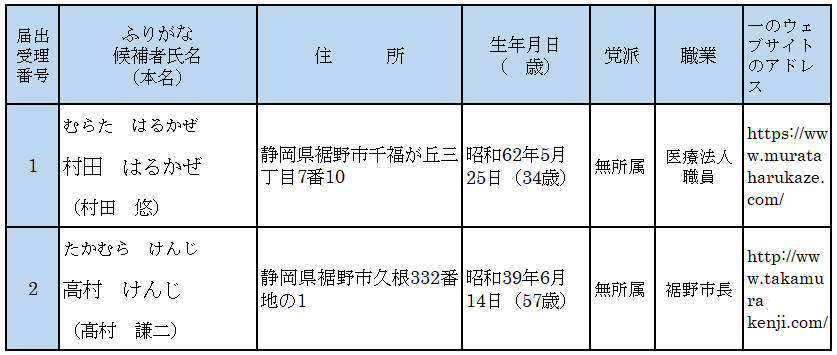裾野市長選挙・裾野市議会議員補欠選挙候補者一覧/裾野市 - 裾野市 https:
