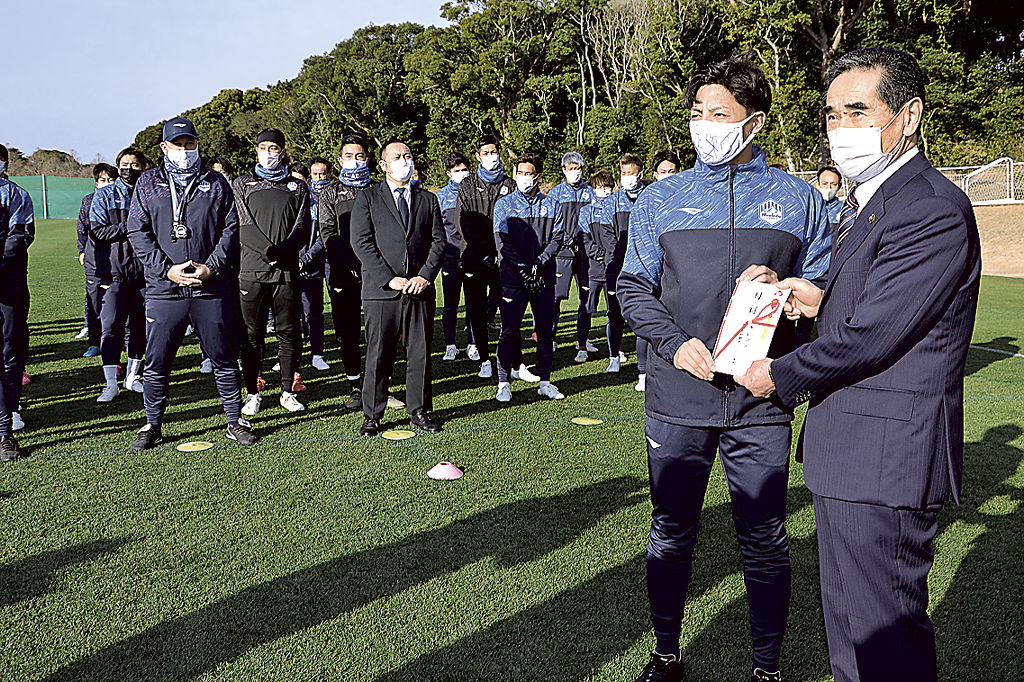 J2山形キャンプ歓迎 御前崎でセレモニー、市長が特産品贈る|あなたの静
