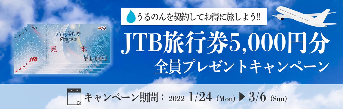 宅配水サービス「うるのん」新規お申込みで全員にJTB旅行券5,000円分プレゼ