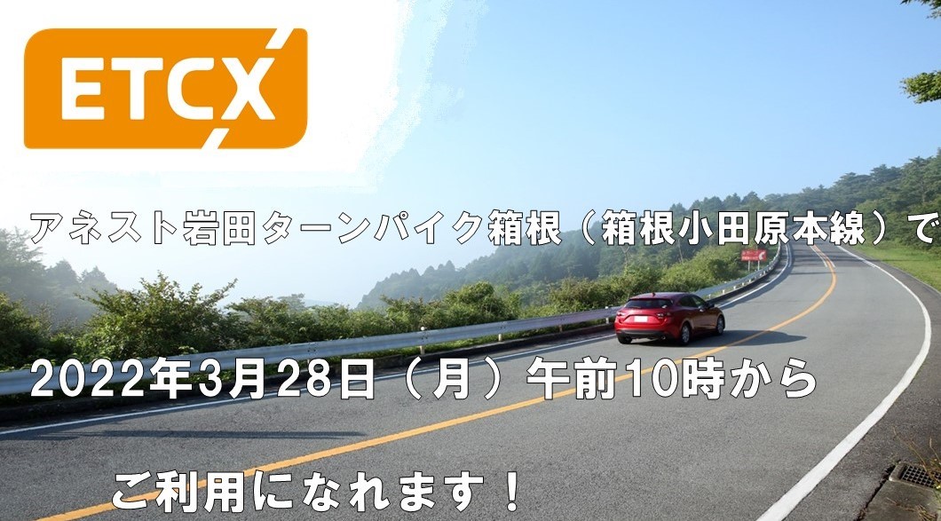 アネスト岩田 ターンパイク箱根(箱根小田原本線)で、3 月28 日(月)午前10 時から「ETCX」をご利用いただけます。 – PR TIMES https://t.co/9OYNsZjiIB #静岡県 #静岡県東部 #伊豆市 https://t.co/4HBtvCTYW6