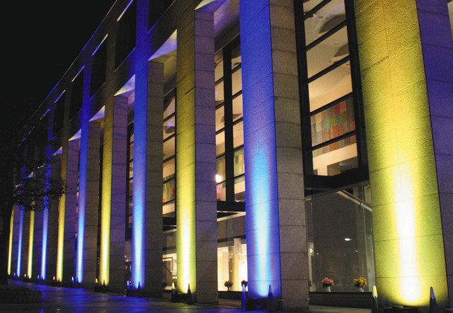 ウクライナ国旗をイメージ 富士市文化会館、平和願いライトアップ - 東京新