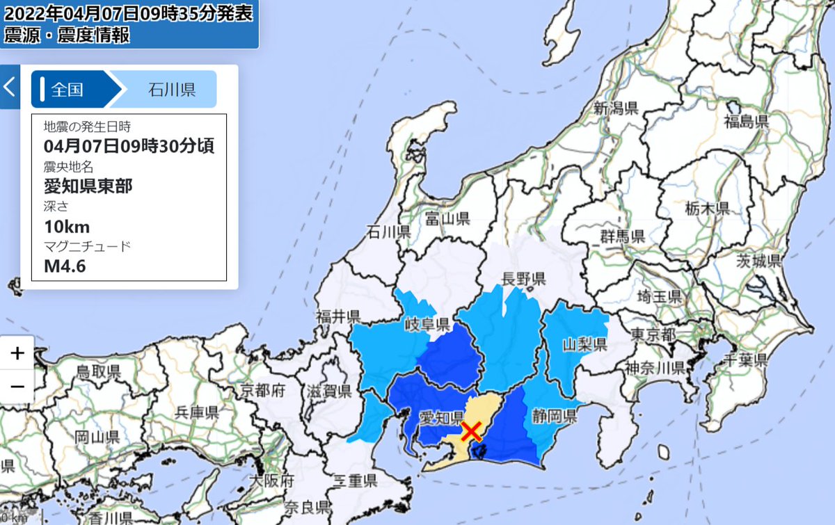 愛知県で震度4の地震、福井県でも揺れ観測 各地の震度一覧 4月7日気象庁 -