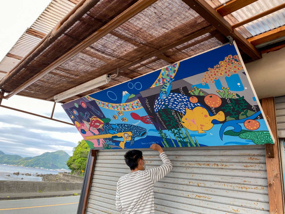 沼津市公認おさかなアートクリエーターの鈴木翔太君が描いた富士山と魚の絵