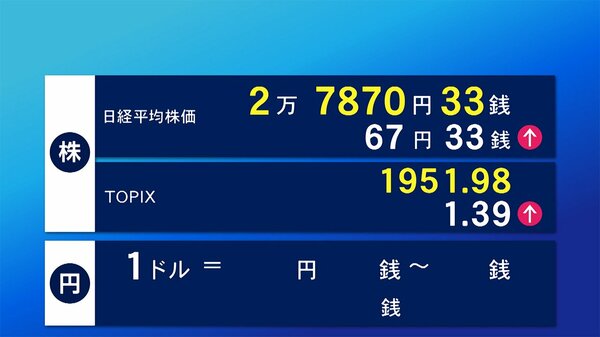 週末の株価は一進一退 前場は67円33銭高の2万7870円33銭で終了 - FNNプライ