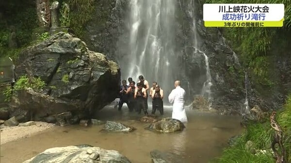 川上峡花火大会に向け手筒花火披露する男性たちが滝行 成功祈願 佐賀市 - F