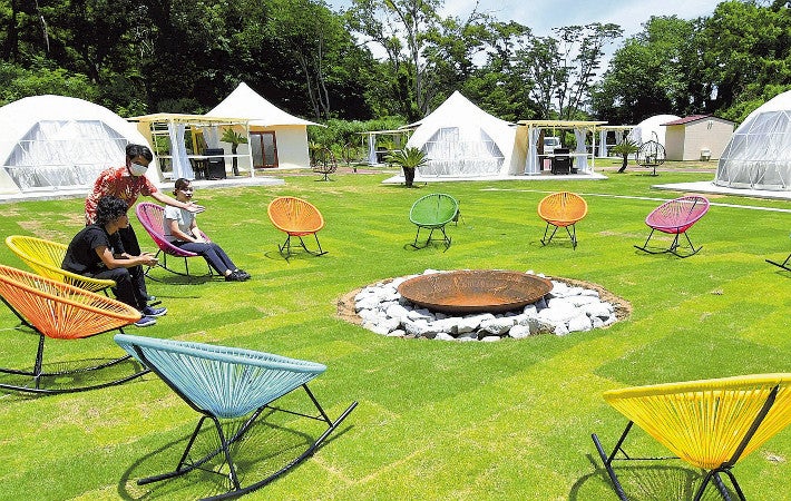 テラスでBBQ、夜は広場でたき火…伊豆にテント型客室でホテル並みサービ