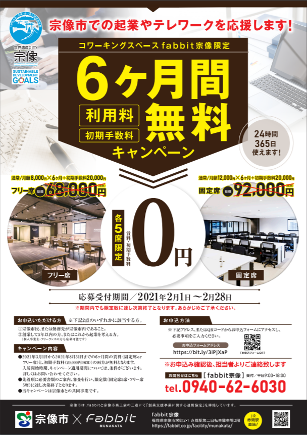 fabbit宗像限定、宗像市での起業やテレワークを応援するキャンペーンを開始