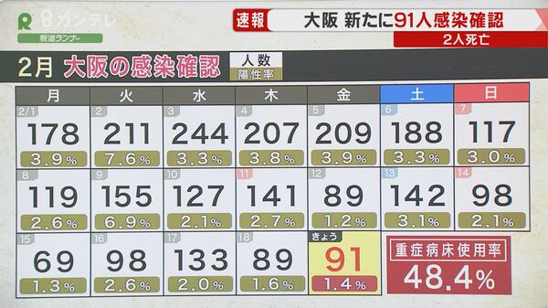 大阪府で新たに91人の感染を確認 感染者2人が死亡 陽性率1.4% 守口市の高