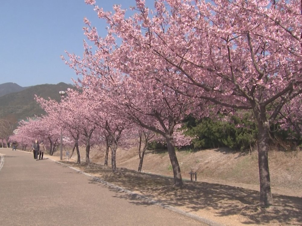 暖かさで一気に花開く…河津桜が満開 公園を囲むように約150本 2月末まで見