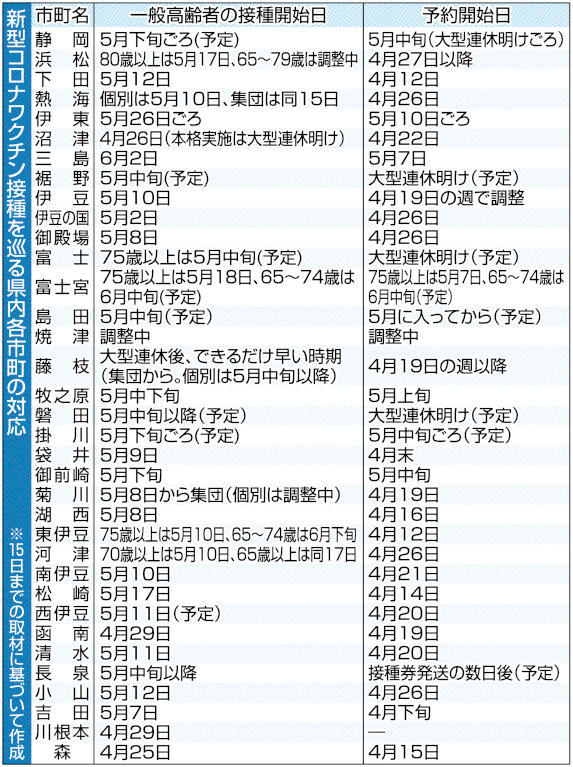 一般高齢者向け接種 静岡県内市町、GW後に本格化 新型コロナワクチン|あ