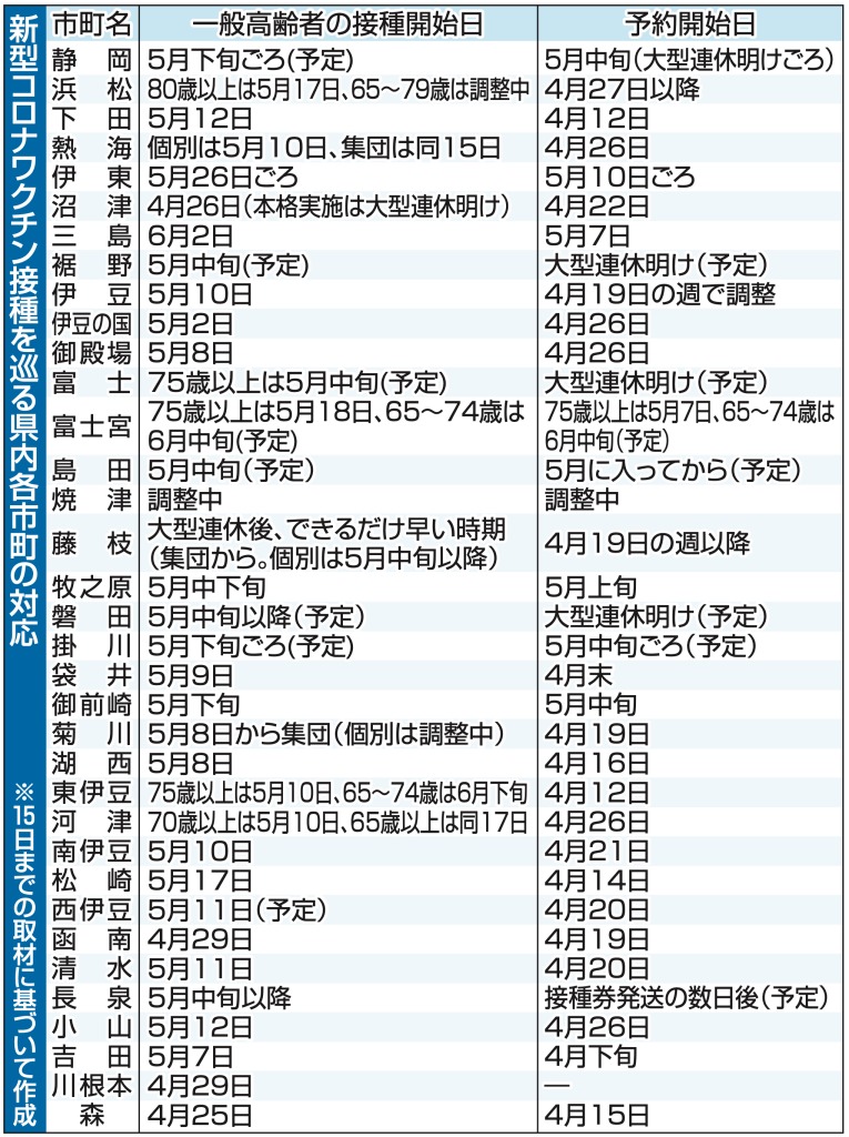 一般高齢者向け接種 静岡県内市町、GW後に本格化 新型コロナワクチン(あな