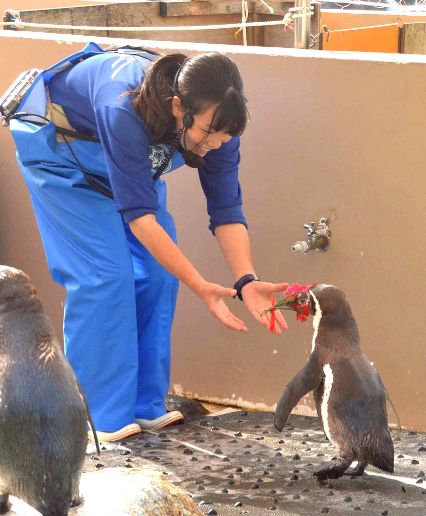 “ママ”カーネーションどうぞ 母ペンギンとひな紹介も 下田海中水族館でショ
