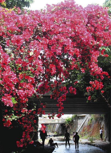 糸川を彩る赤や紫色 ブーゲンビリア見頃 熱海、ライトアップも - 東京新聞