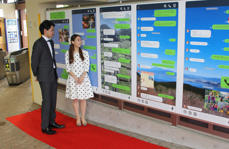 LINE画面風看板でPR 男女のやりとり、伊豆の住みやすさ訴え(毎日新聞) -
