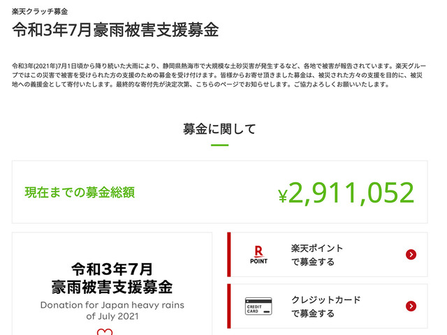楽天、熱海市など豪雨災害の復興を目的とした募金窓口を設置--楽天ポイント