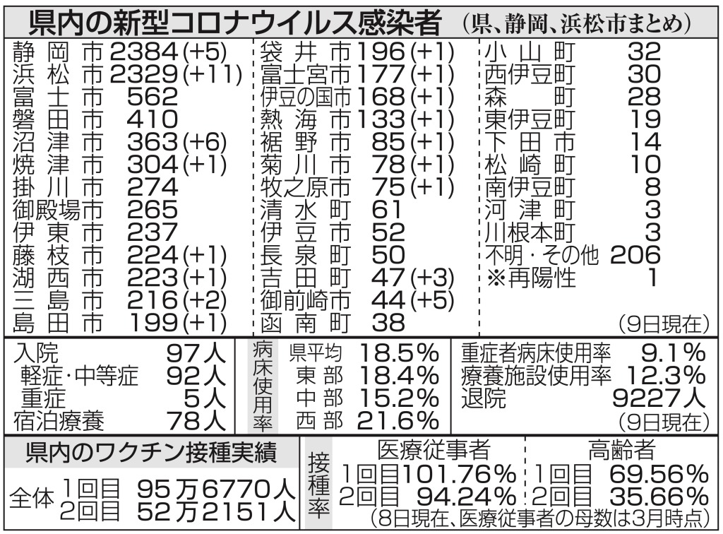 新たに計43人感染 9日の静岡県内、御殿場ではスポーツスクールでクラス