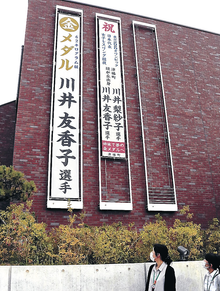 姉妹の快挙に祝福の輪 東京五輪レスリング 金メダルたたえ懸垂幕(北國新聞