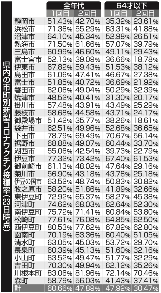市町別接種率を初公表「ばらつきある」 静岡県内、コロナワクチン(あなた