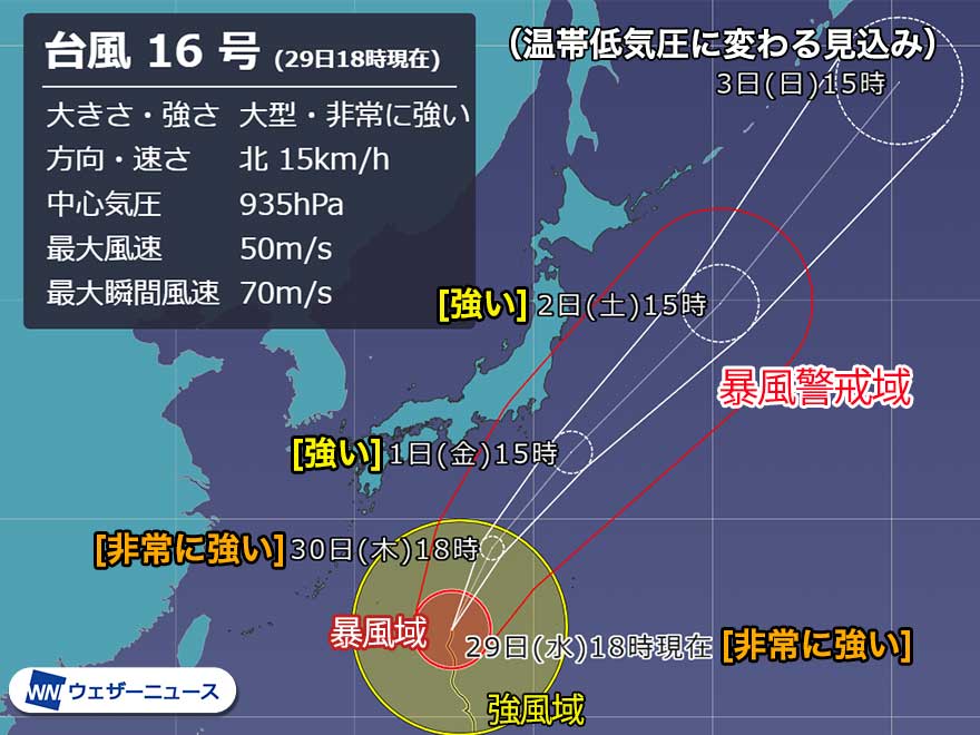 台風16号 1日(金)に伊豆諸島〜関東へ 大雨・暴風への備えは今のうちに - ウ