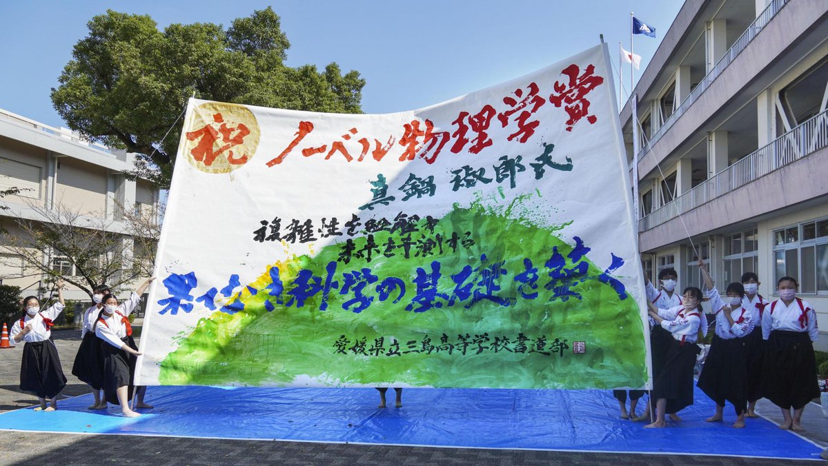 真鍋淑郎さんの母校書道部が揮毫 ノーベル賞受賞でお祝い(共同通信) - Ya