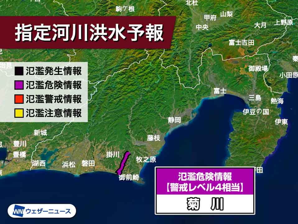 静岡県 菊川が氾濫のおそれ 警戒レベル4相当の氾濫危険情報発表(ウェザー